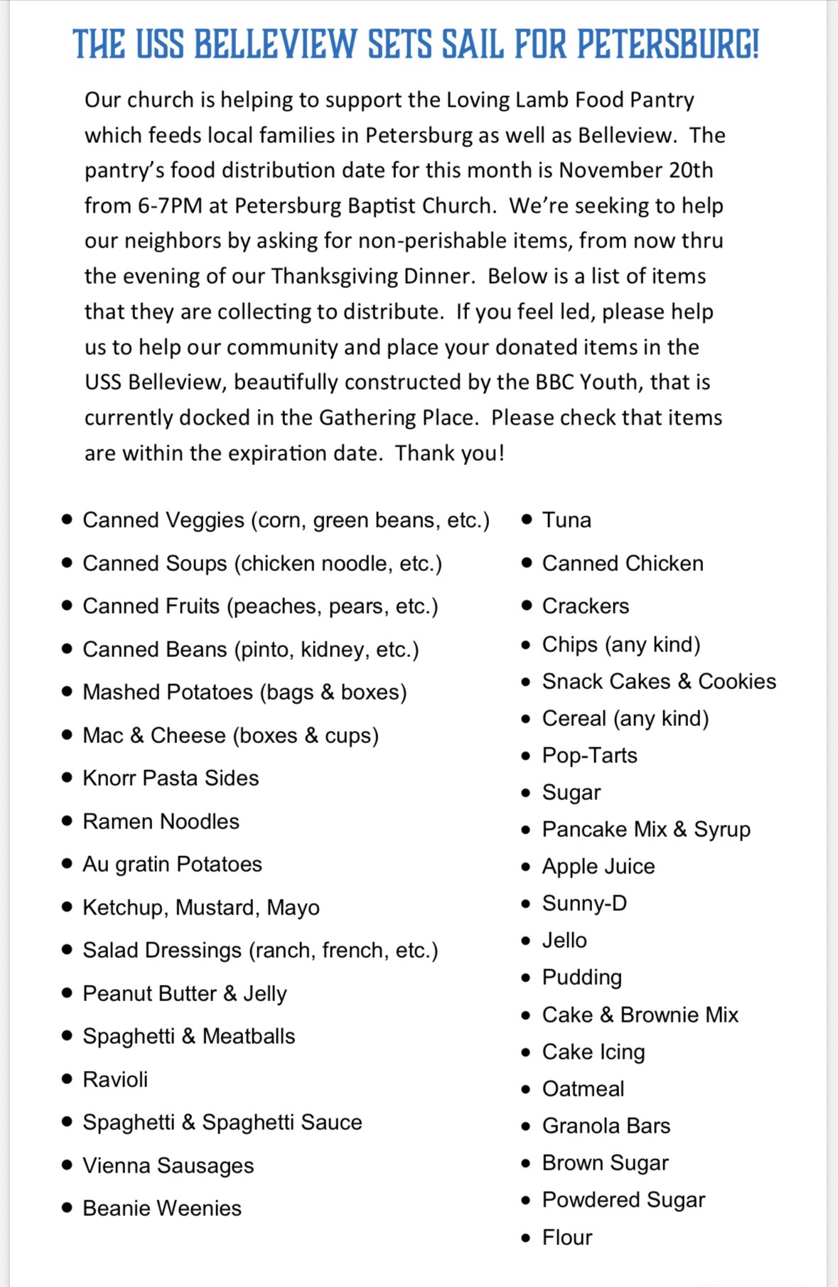 Our church is helping to support the Loving Lamb Food Pantry which feeds local families in Petersburg as well as Belleview. The pantry’s food distribution date for this month is November 20th from 6-7PM at Petersburg Baptist Church. We’re seeking to help our neighbors by asking for non-perishable items, from now thru the evening of our Thanksgiving Dinner. Please see the list of items that they are collecting to distribute. If you feel led, please help us to help our community and place your donated items in the USS Belleview, beautifully constructed by the BBC Youth, that is currently docked in the Gathering Place. Please check that items are within the expiration date. Thank you!